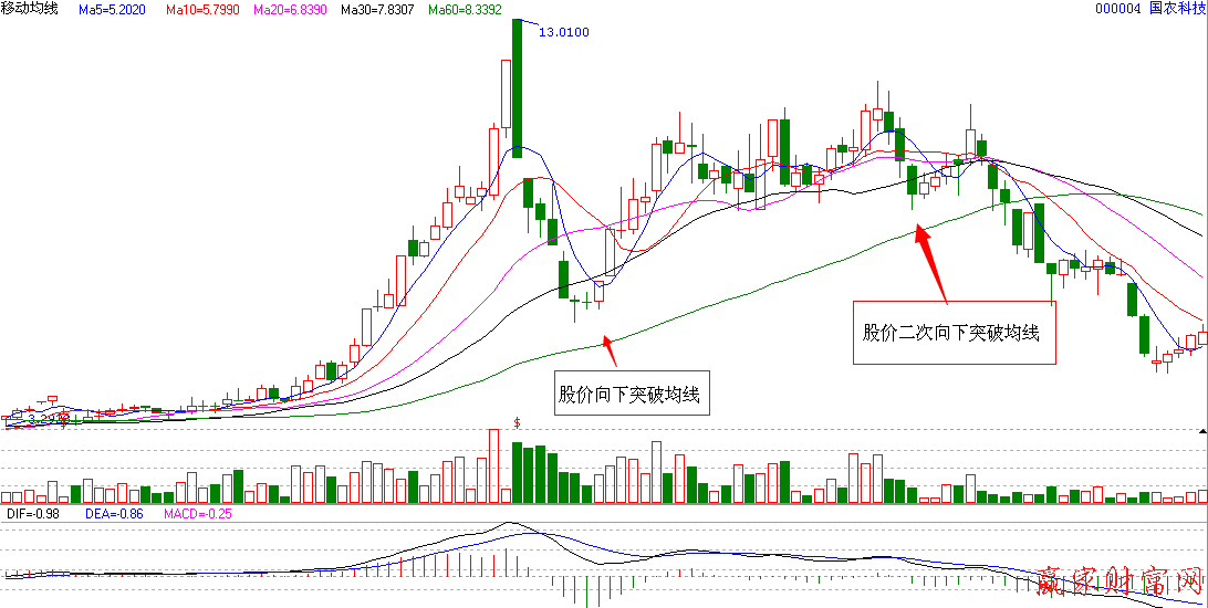 如上圖所示為000004國農科技周K線圖,我們以20周均線為例,股價從市場高位一路下跌之后,出現了明顯的反彈行情,但是在圖中我們看到,股價在反彈之后二次向下突破,所以后市還會有持續下跌的趨勢,這個時候投資者不能見到有了很深的下跌空間而過早入場,因為此后股價可能一直沿著移動平均線向下運行。