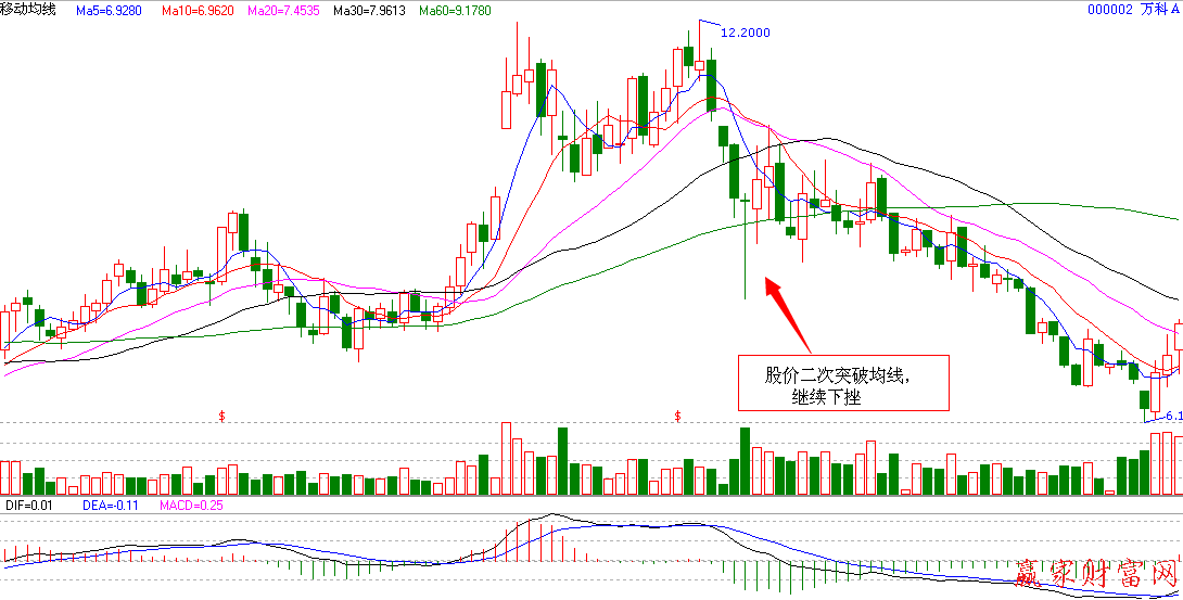 下圖為000002萬科A的周K線圖,股價從12.2000元開始向下運行,而在箭頭指向位置,股價二次向下跌破了10周移動平均線,這就意味著股價將繼續原有的下跌走勢。因此,此時賣出股票是最佳選擇。