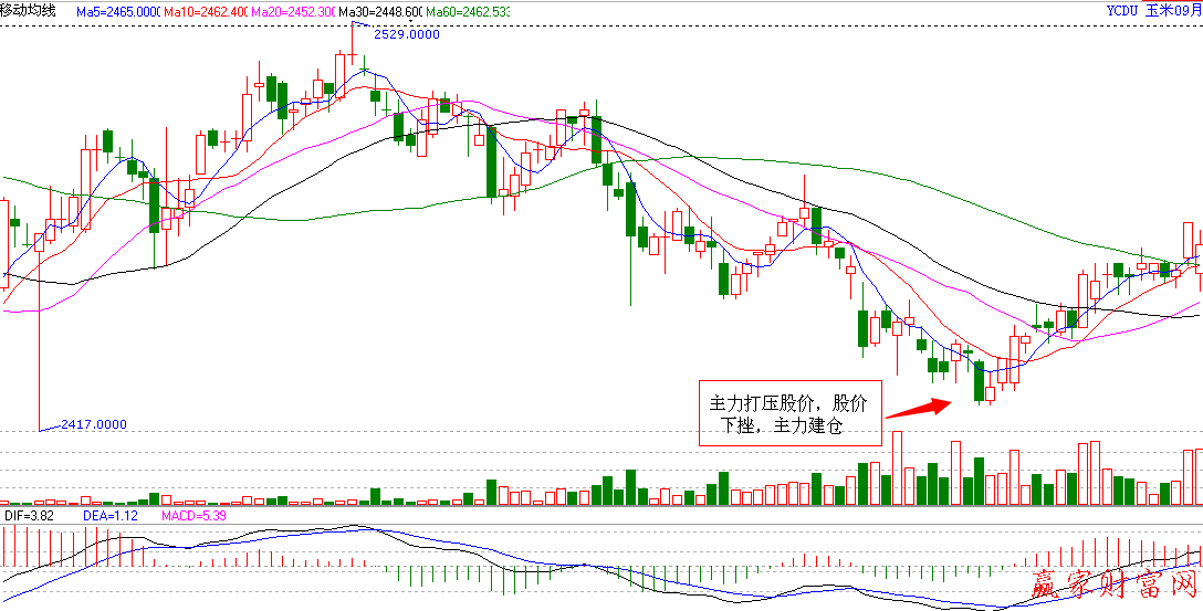 如圖為YCDU玉米09月日K線圖,股價2529.0000元高位開始下行,至箭頭所指位置達到最低價位,然而主力機構在股價達到最低之前,陰K線的實體已經(jīng)有所減小,這說明已經(jīng)有做多的能量進場阻止價格大幅下跌,這就是主力建倉的標志。