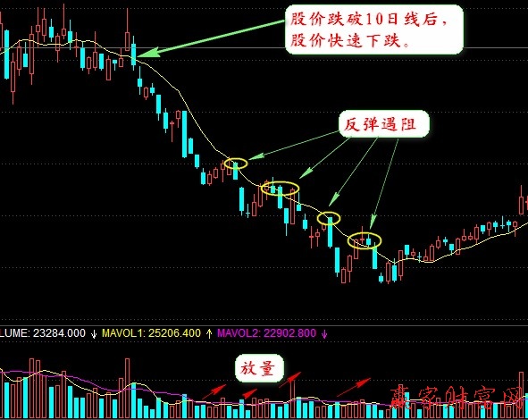 2.在圖中,可以看到股價出現了迅速下跌,讓很多的投資者都不知所措。但是,隨后出現了持續放量的現象,股價又重新出現了上漲的現象,但是仍然無力突破10日移動平均線的壓力,此時投資者應該謹慎操作,否則的話將會虧損巨大。因為此時股市將繼續下跌,及時賣出才是最明智的做法。