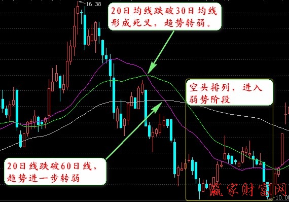 2.其次,讓我們看看利用均線怎樣來判斷股市的強(qiáng)勢(shì)階段轉(zhuǎn)為弱勢(shì)階段的狀況。而此過程的變化同樣也不是一個(gè)一蹴而就的過程,而是一個(gè)循序漸進(jìn)的過程。首先,當(dāng)我們看到當(dāng)大盤日K線上的20日均線彎曲向下與30日均線形成死叉時(shí),那么此時(shí)的股市向我們傳達(dá)著一個(gè)十分重要的信號(hào),那就是大盤已經(jīng)漸趨轉(zhuǎn)向弱勢(shì),此時(shí)的投資者在操作的時(shí)候應(yīng)該謹(jǐn)慎,及時(shí)離場,否則你將會(huì)被套牢,陷入不可自拔的窘困之地。隨后,繼續(xù)觀察股市的變化,當(dāng)20日均線繼續(xù)下滑與60日均線形成金叉時(shí),通常投資者會(huì)在此時(shí)感到欣慰,因?yàn)檫@是一個(gè)上漲的信號(hào),其實(shí)不然,它反而更加強(qiáng)烈的反應(yīng)出股價(jià)的進(jìn)一步的轉(zhuǎn)弱。而當(dāng)30日均線彎曲向下與60日均線形成死叉時(shí),說明大盤已經(jīng)轉(zhuǎn)弱了,此時(shí)的交易量出現(xiàn)了銳減的現(xiàn)象,大盤一片死寂沉沉的現(xiàn)象。最終,20日、30日、60日均線都呈空頭排列時(shí),才標(biāo)志著大盤已進(jìn)入了弱勢(shì)勢(shì)階段,此時(shí)投資者已經(jīng)對(duì)股市死心了。但是,值得我們注意的是,大盤也有翻盤的可能,因此投資者需要做好兩種準(zhǔn)備。