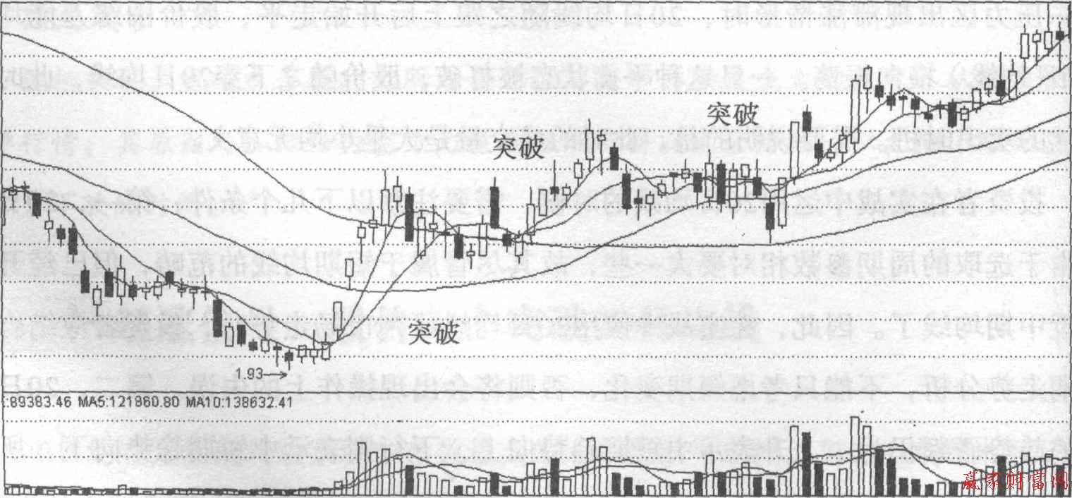 在市場的實際操作過程中,投資者一旦發現股價自下而上突破均線并繼續向上 的情況出現,可以視此為買入時機?!「爬▉碇v,均線由下降逐漸轉為上升,而股價曲線從均線下部突破均線交叉向上,此時為買進信號。值得投資者注意的一點是,移動平均線一定要有向上抬頭的跡象,說明市場行情由跌轉漲,此時為買進信號才更確切。若市場為空頭市場,而且此時的股價是自下而上依次突破短期、中期均線的時候,也是投資者應該抓住的買入時機。