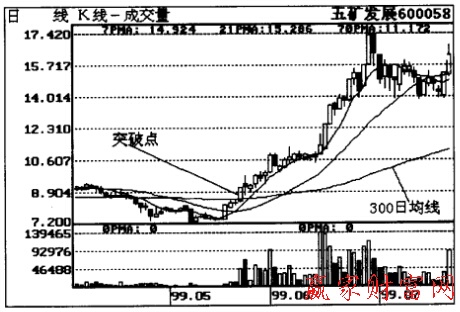 例如,五礦發(fā)展(600058)1999年在“5.19”行情中啟動(dòng),于6月1日以中陽(yáng)線(xiàn)成功突破300日均線(xiàn),6月底最高價(jià)達(dá)到17.42元,如果投資者能夠在股價(jià)突破300日均線(xiàn)當(dāng)天或第二天買(mǎi)入,收獲一定不小。