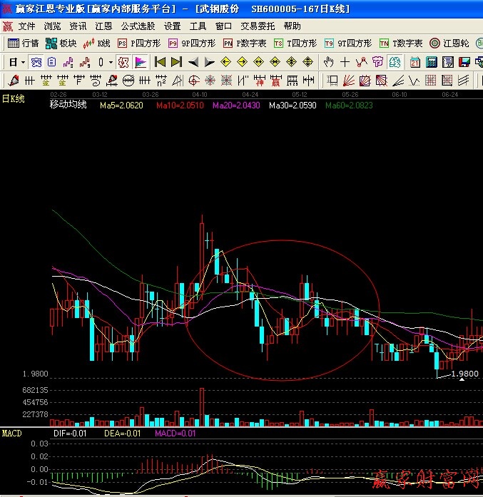 圖中所圈出的一種形態為二次交叉向下發散形態。5日短期均線在高位調頭之后下跌,均線系統開始向下發散,但是到波谷時股價進入整盤時刻,股民就需要密切注意股價突破整盤區域時的方向。一旦股價結束整盤行情,股價二次出現交叉向下發散,就表述股價將繼續下跌,空頭真正打壓股價的時刻正是此時。