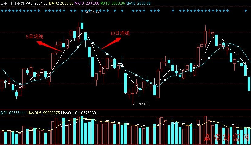當(dāng)市場見頂時就會向下有效跌破10日均線,形成下跌走勢。在下跌通道中,10日均線對市場反彈形成阻力。股價每次反彈治10日均線位置時,收到10日均線壓制,都會出現(xiàn)重新下跌。