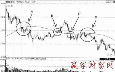 包鋼股份(600010)的日K線圖,圖中顯示的是60日均線,在A處,股價通過快速下跌的方式跌破60日均線,在這里經過兩次反彈也沒有再次突破60日均線,從而股價繼續下行。但這時60日均線還是向上走的,所以后面應該還有機會。