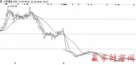 如果在高位出現,有兩種可能,一是主力在震蕩洗盤,二是主力在震蕩出貨,再來看一下山東黃金,漲幅已巨大,即使主力有能力再做上一波,散戶還是清倉離場為妙,因為一旦下跌,跌幅是散戶沒有辦法想到的,如圖所示.