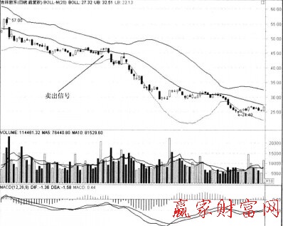圖1為吉林敖東日K線圖。從圖中我們可以看出該股一直運行在BOLL中軌和下軌之間,說明市場非常弱勢,當股價每次反彈中軌就是清倉的好時機。