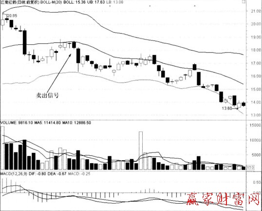 圖2為江南紅箭日K線圖。該股在跌破BOLL中軌后一直運行在BOLL中軌和下軌之間,這說明市場非常弱勢,投資者在遇到這種走勢時,應該保持高度警惕,操作策略上以空倉為主。
