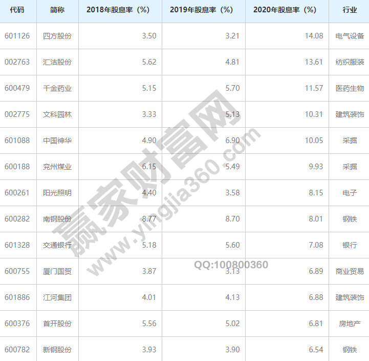 五年均值前10名,股息率區間為10.9%-5.8%: