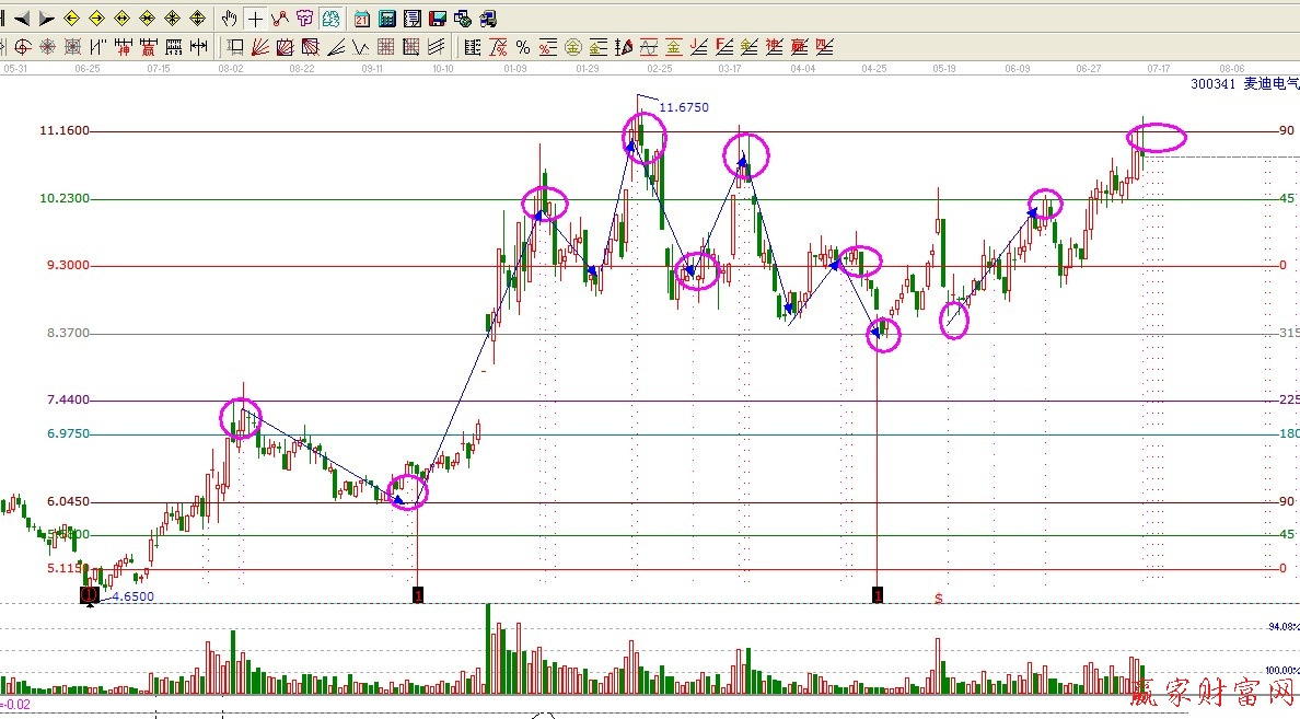 下面我們就用k線價(jià)格四方形來(lái)分析300341.首先我們選2013年6月25日的低點(diǎn)4.65為起點(diǎn)畫(huà)K線價(jià)格四方形,我們可以看到再之后個(gè)股的運(yùn)行中,很多重要的高低點(diǎn)位,買(mǎi)點(diǎn)賣(mài)點(diǎn)都在畫(huà)線的位置形成,讓我提前知道個(gè)股未來(lái)可能運(yùn)行到的關(guān)鍵點(diǎn)位從而及時(shí)作出應(yīng)對(duì)策略。為我們的買(mǎi)賣(mài)提供了依據(jù),同時(shí)再結(jié)合我們的時(shí)間工具(豎線),我們更是能提前知道可能發(fā)生趨勢(shì)轉(zhuǎn)變的時(shí)間窗口,更是提高了我們的操作成功概率。