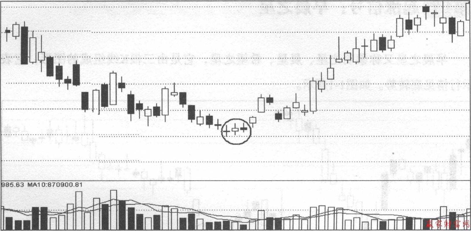 底部三顆星的特征為:三根十字星應(yīng)出現(xiàn)在一段深跌后的低位;三根十字星應(yīng)呈橫向排列或逐漸上漲的排列;第一根十字星的前面應(yīng)是一根較大的陰線;多于三根十字星的走勢也按三根十字星底部形態(tài)操作;三根十字星不分陰線、陽線,但最好全是陽線。在一波兇悍的重挫發(fā)生之后,第一根十字星表示空頭拋壓減輕,多頭試探性入場;第二根十字星意味著多頭繼續(xù)入場,空頭仍頑強(qiáng)抵抗;接下來,空頭轉(zhuǎn)入防守領(lǐng)域,多頭開始組織進(jìn)攻。如果十字星逐級(jí)升高,則后市反轉(zhuǎn)的可能性會(huì)逐漸增大。