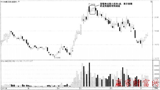 如下圖所示,為中文傳媒(600373)于2011年11月15日左右形成的趨勢(shì)減緩的小實(shí)體K線形態(tài)。從圖中標(biāo)志區(qū)可以看出,在股價(jià)走勢(shì)逐漸進(jìn)入高價(jià)區(qū)域之后,反復(fù)出現(xiàn)了多個(gè)小實(shí)體K線,這些小實(shí)體K線的出現(xiàn),預(yù)示著之前的漲勢(shì)行情己經(jīng)開始弱化,走勢(shì)己經(jīng)趨于緩和,因而也可以看到,之后的股價(jià)走勢(shì)開始反轉(zhuǎn)而下,所以當(dāng)投資者在面對(duì)此類型的K線走勢(shì)時(shí)應(yīng)該及時(shí)止盈。