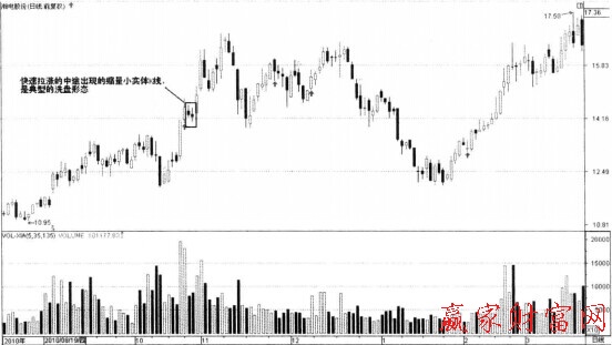 再如下圖所示,是湘電股份(600416)于2010年10月28日左右形成的洗盤小實(shí)體K線形態(tài)。從圖中的標(biāo)志區(qū)可以看到,在股價(jià)上漲的中途階段,出現(xiàn)的小實(shí)體K線在短期的調(diào)整之后,對(duì)部分浮動(dòng)的籌碼進(jìn)行了清洗,因而后期股價(jià)走勢(shì)也得以延續(xù),此時(shí)的小實(shí)體K線明顯地扮演著中繼洗盤的作用,投資者此時(shí)應(yīng)耐心等待,避免浮躁心理。