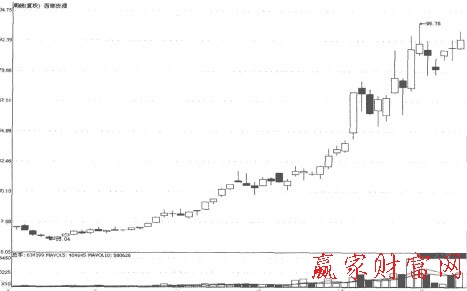 圖為西部資源(600139) 2008年9月至2009年10月期間周K線走勢(shì)圖,如圖所示,此股在步入上升趨勢(shì)后,其周K線是以連續(xù)的小陽(yáng)線和經(jīng)常性的大陽(yáng)線為主基調(diào)的,而且其中很少有陰線形態(tài)出現(xiàn),這正是周K線對(duì)于上升趨勢(shì)的直觀體現(xiàn)。