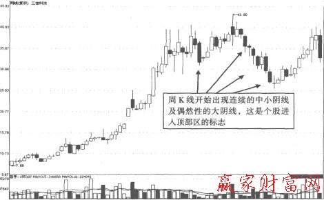 當(dāng)股市或個(gè)股經(jīng)長(zhǎng)時(shí)間上漲而進(jìn)人高位區(qū)后,由于多方力量不再占有明顯的主導(dǎo)地位,此時(shí),周K線在形態(tài)上往往會(huì)因空方在單周內(nèi)的大力拋售而出現(xiàn)大陰線形態(tài),或是因?yàn)榭辗皆陂L(zhǎng)時(shí)間內(nèi)占據(jù)一定優(yōu)勢(shì)而出現(xiàn)連續(xù)的小陰線形態(tài),同時(shí),價(jià)格走勢(shì)也會(huì)呈現(xiàn)出震蕩滯漲,這是市場(chǎng)進(jìn)入頂部區(qū)的標(biāo)志。