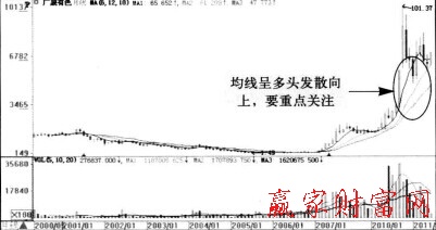 圖1,觀察月K線中均線的形態,從圖中可以看出,在2010年12011年這段時間內,該股的月K線上均線都呈現出多頭發散向上的狀態,預示著股價將上漲,投資者應重點關注并擇機買入。