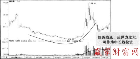 圖2,觀察月K線的形態,從圖中可以看出,從2002年一直到2007年,月K錢都呈現出圓孤底的形態,股價也從底命的1.72漲到了 29.99元,漲勢非常的兇猛。那么頭肩底形態又要怎么理解呢?