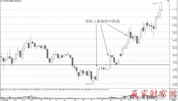 為什么短上影線的周陽線是最強的走勢呢?原因是,周K線拉中陽,就意味著買方占壓倒性的優(yōu)勢。帶一個短小的上形線,又表明買方適度讓步。這實際上是一種主力洗盤的動作,這種洗盤是很有限度的,但卻十分有效,因為主力在周末最后一兩個交易日內(nèi)打壓股價,迫使短線持股者在周末之前賣出該股。同時該股由于本周漲幅巳大且在周末遭到打壓,股評也不敢繼續(xù)看好下周走勢,然而股價卻在眾人的猶豫之中再度大幅拉升。短上影線實際上是多方有限度地退讓,其目的是為了更好地打敗空方。如下面兩圖所示。