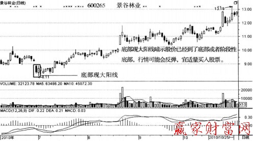 事實上,底部現大陽線K線組合不僅適用于熊市中,即使在牛市中也同樣適用于選股操作。另外,底部現大陽線K線組合形態應用下大盤趨勢分析中也十分有效,常常能把握市場的拐點。底部現大陽線K線組合形態在股指中出現的次數不多,但非常準確。