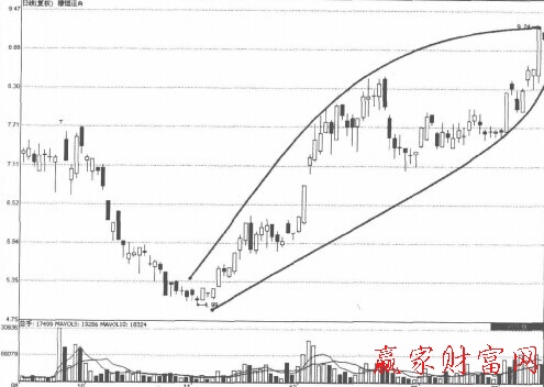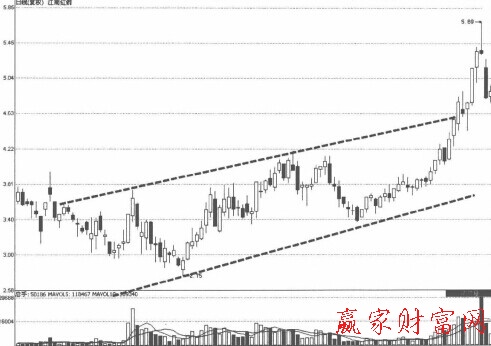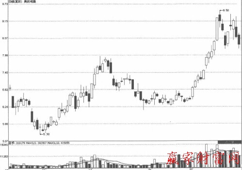 上圖為江南紅箭(000519) 2008年9月10日~2009年2月19日期間走勢圖。此股在大幅下跌后,在低位區(qū)出現了企穩(wěn)上揚的走勢。從圖中虛線標注的一段走勢,我們可以看到此股經常性地出現實體極大的大陽線形態(tài),這種大陽線形態(tài)使得個股的股價重心不斷上移,這是莊家在當日建倉力度較大的表現;而同期的陰線實體則顯得相對短小,這是市場空方力量相對較弱的表現。