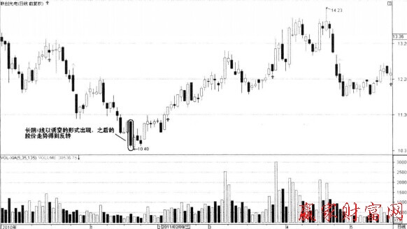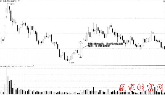 如圖所示,為浙江龍盛(600352)于2011年2月10日形成的推漲長陽K線形態。從圖中標志區可以看到,長陽K線正處于該股股價上漲的中途,意味著對漲勢的繼續加速,因而理所當然地暴露了一個鮮明的買點信號,對于投資者而言,此時選擇進入該股,可以很容易收獲一些利潤。