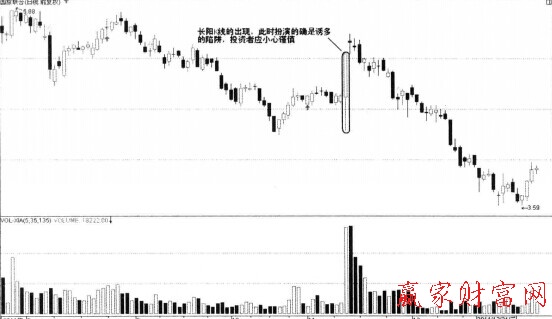 如圖所示,為國旅聯合(600358)于2011年11月11日形成的誘多長陽K線形態。從圖中標志區可以看到,股價在平臺鋪整后出現了長陽K線,翌日則出現一根小K線,意味著漲勢的動力迅速衰減,說明缺乏推漲合力,因而后期股價的整個走勢開始不斷地下行,此番誘多行為害苦了一批追漲的投資者,因而投資者在追漲時應注意規避風險,切勿沖動。一定要知道投資股票的風險知識。