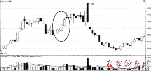 一般來講,連續五條陽線是上升行情中的強勢表現。但是,由于連續多日的上漲,累計升幅已經很大,技術指標會出現超買現象,獲利回吐必然會抑制股價上行。十字線或星形線,就是賣盤大量涌出的結果。