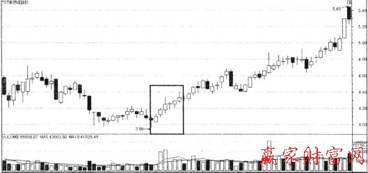 所謂低檔五根陽線是指在下跌持續一段時期后,K線圖連續出現了五根陽線(有時可能是六根或七根),表示在此價位多方承接力量較強。低檔五根陽線的圖形如圖所示。