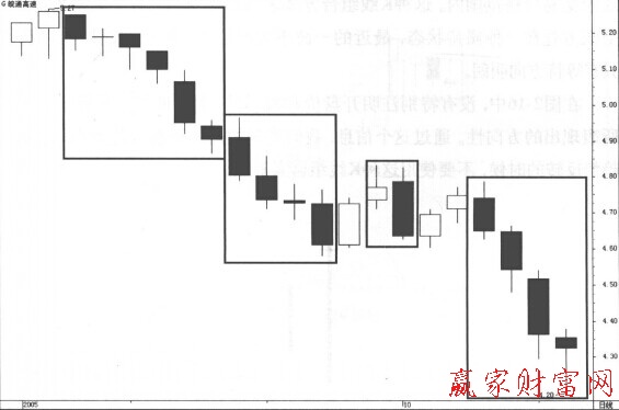 接下來我們再看一張具有下跌方向性的K線組合圖,圖3是皖通高速(600012)2005年9月12日~10月18日的價格走勢圖。圖中標記框的地方都是這種具有方向性K線的地方,我們可以看到每一根K線對于前一根K線來講都是具有更低的低價的方向性K線組合,這種情況對于做股票的交易者來講,不能進場,只要不出現對多方有利的K線形態,我們就可以一直等待,以回避風險。一旦交易者遇到這類走勢,不要輕易進場,不能因為某些與交易無關的因素影響我們獲利。請大家注意:這里并沒有涉及收盤價與開盤價的相對位置,也就是說,這里并沒有根據陰線陽線來看方向性。這種K線形態其實與趨勢的定義是完全一樣的,當有更低的高點與更低的低點出現時就是向下的趨勢狀態,當有更高的高點與更高的低點出現時就是向上的趨勢狀態。只是這種情況看起來更流楊一些,并且其中沒有逆向的走勢狀態(當然,您也可以把上影線與下影線看做是對趨勢的回調或者反彈)。