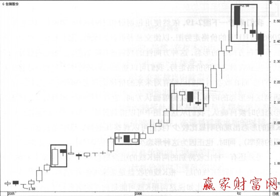 我們來看圖中,用包鋼股份(600010)2005年12月9日~2006年明17日的價格走勢圖,以便交易者更容易理解。在圖中方框內的價格都是這種沒有方向性的狀態,我們只有通過后面的價格走勢才能知道價格的運動方向,而在當時我們是無法清楚未來的價格運動方向的。因此,我們避免用這種狀態確認方向。但是,我們從這張圖中可以得到另外一個有意思的啟發:如果前面的方向是向上的,那么這種停頓后的方向更可能是向上的。那么只要后面不出現相反的有方向性K線,我們依然可以持有原來的頭寸。這種組合也被稱做“內包”狀態。這就好像是趨勢中的盤整狀態一樣,市場在此做了一下修正喘息,如果沒有更大的外力進來,市場通常會延續原來的走勢繼續運動。如果出現了相反方向的走勢,交易者一定要注意,這可能是更強的市場力量正在介入。