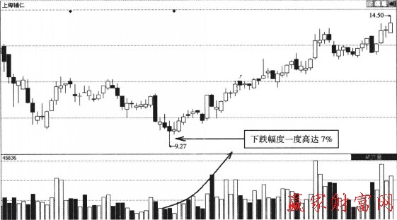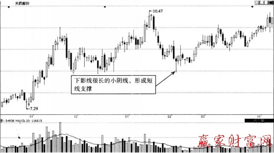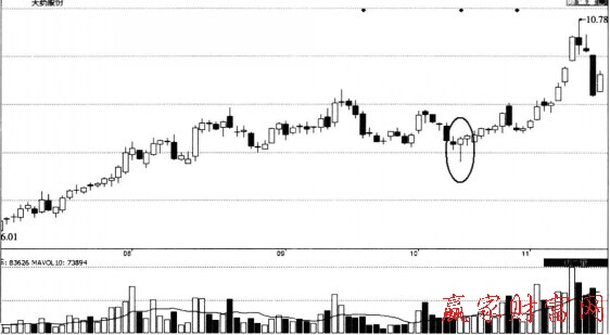 如圖1所示,天藥股份的日K線中,該股在10.47元見頂回落,直到一根下影線很長(zhǎng)的小陰線確認(rèn)了該股短期底部,反彈才開始展開。從成交量上來看,出現(xiàn)這根下影線很長(zhǎng)的小陰線之后,成交量卻有所放大,帶動(dòng)該股從調(diào)整的行情當(dāng)中解脫出來。