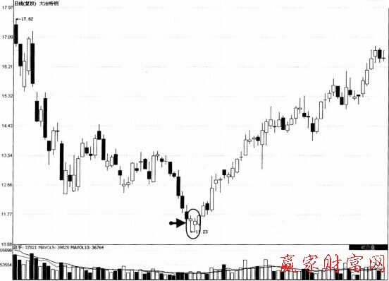 如圖為大冶特鋼(000708)2010年4月29日至2010年9月6日期間走勢圖。此股在短時間快速下跌之后于階段性的低點出現了低檔雙陽長影線的形態,這是多方有意發動反擊、空方己無力再度打壓的標志,此時可以進行短線買股操作。