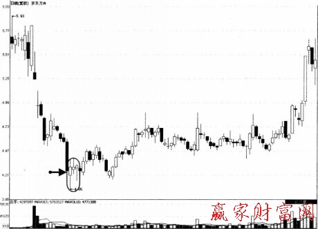 如圖為京東方A(000725)2010年6月1日至2010年10月27日期間走勢圖。此股在經短期一波深幅下跌后,于階段性的低點連續三日出現了影線較長的陽線形態。這既是止跌企穩跡象的顯現,也是多方有意反攻的信號,此時可以進行積極的短線買股操作。
