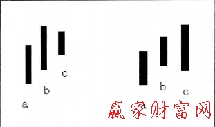 如圖所示,b和c是具有母子關系的母子K線,b和a非母子關系。當b的高點大于a的高點時,b和c取向上合并。