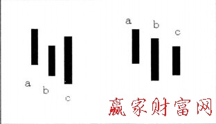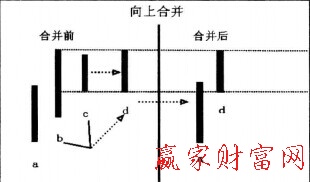 如圖所示,a、b、c為向上合并,b、c母子K線取母高子低,經合并后變成新K線d,原a、b、c三根K線合并后變為a、d。