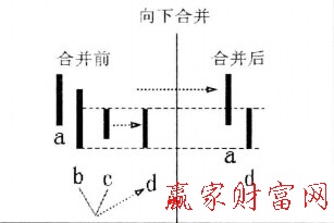 如圖所示,a、b、c為向下合并,b、c母子K線取母低子高,經合并后變成新K線d,原a,b、c三根K線合并后變為a、d。