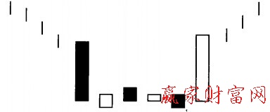 塔形底因左右兩根塔線得名。塔線即一根大陰線和一根大陽線,兩根塔線中件均為小陰線或小陽線,如圖所示。