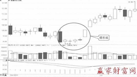 如圖所示,2010年9月中下旬,恒星科技(002132)的日K線圖上出現了塔形底形態。這表明空方力量衰竭,多方力量極度強勢,市場將進入多方主導的上漲行情。所以,當形成塔形底形態時,投資者可以買入股票。