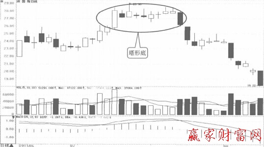 如圖所示,2011年7月中下旬,深國商(000056)的日K線圖上出現了塔形頂形態。這表明多方力量已經衰竭,空方力全逐漸占據主動,市場將進入以空方為主導的下跌行情。因此,投資者看到此形態后,應盡快賣出手中股票。