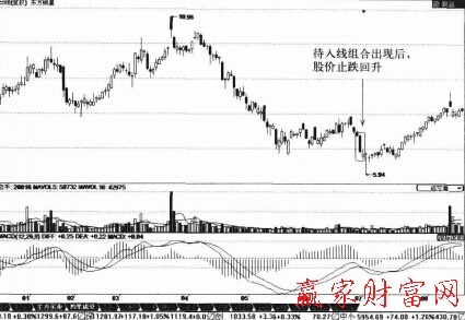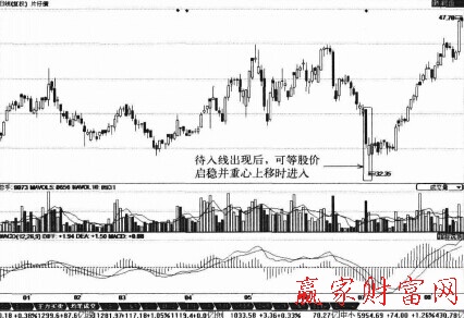 從上圖可以看到,當股價經過快速下跌后,出現了待入線K線組合,待入線的第二根陽線是以錘頭線的形態出現,而錘頭線本身便是一個止跌回升信號,此錘頭線又與前面的大陰線組合成待入線形態,所以此時可關注股價后期走勢變化。只要股價不創錘頭線的最低價,并且重心開始向上移動,便可買入。