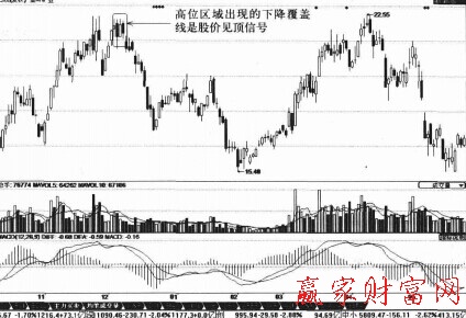 從圖中可以看到,當股價在高位區城首先出現了穿頭破腳K線組合時,在前面講到過,高位區城出現的穿頭破腳為趨勢逆轉信號,而在這個穿頭破腳組合之后又收出一根陽K線和一根陰K線,這又構成了下降覆蓋線組合形態。