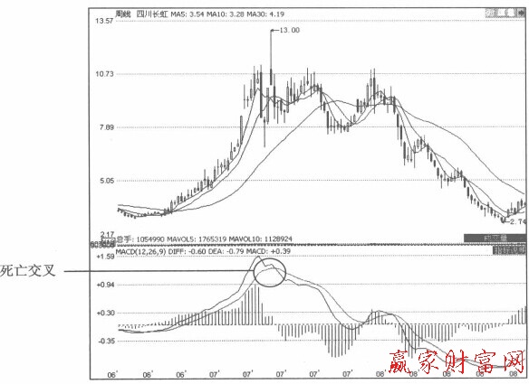 1.圖1所示是四川長虹(600839)的周K線圖和周線MACD,其股價以過大幅拉升后,只出現一次高位死亡交叉,而這一次死亡交叉一出現就宣告行情結束。所以在這種情況下,買進股票,持股待漲,直到周線MACD出現死亡交叉后賣出股票,成本就會翻幾番。