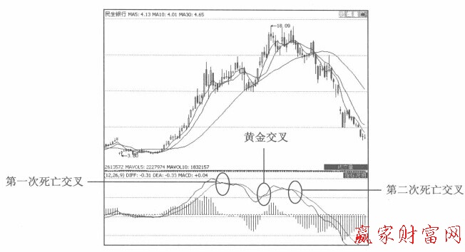 第一次在周線MACD中出現死亡交叉,這時股價已經過大幅拉升,投資者可以賣出所有的股票,收益很不錯。賣過股票后,股價不跌反漲,這時投資者不能再進場,即使進場也要等顯示的信號。