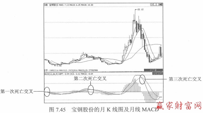 如果要進場,在周線MACD中出現黃金交叉時少量參與,在第二次出現死亡交叉時,賣出所有股票。因為這時周線MACK出現頂背離,即股價上升,而MACD出現下降,并且均線開始發散;K線出現穿頭破腳。如果月線MACD出現死亡交義,則該股票將長期看空、做空,一年之內不要再對它抱有多大希望。寶鋼股份(600019)的月K線圖及月線MACD如圖3所示。