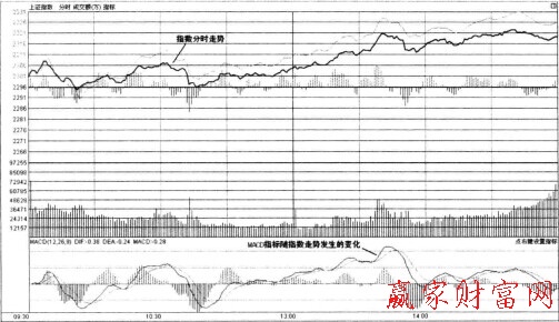 在上證指數的分時走勢中,MACD作為量能的變相指標,對指數的走勢有很靈敏的預判作用。但由于周期的偏小化,也會出現頻繁的騙線行為。作為一位投資者,應該認識到任何指標在漲勢行情中的賣出信號都會弱化,在跌勢行情中的買入信號也都會弱化,應辯證地去看待這些指標,以期在適合的時機選擇好操作方法。如圖所示,為上證分時圖與MACD指標的形態示意圖。