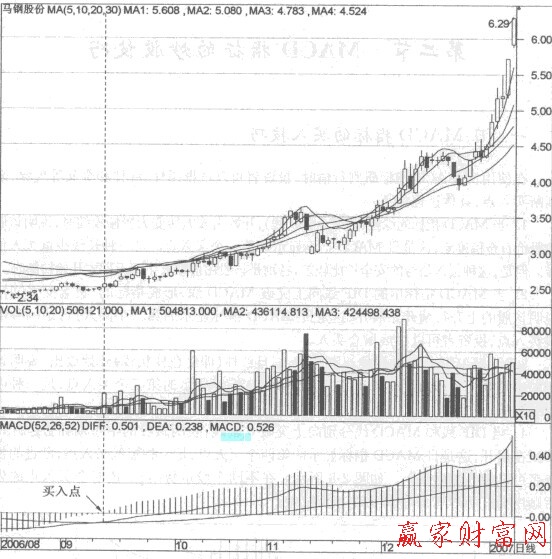 4.當DIF線和MACD線分別向上突破0軸線,表明該股的中短期強勢拉升行情正在展開,這是日MACD指標顯示的第四個買入點,是一種短線買入點,激進的投資者可以短線加碼買入。如圖下圖所示。在不同個股走勢中,上述四個買入點的先后順序會有所不同,但這不影響投資決策。