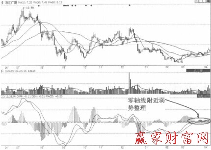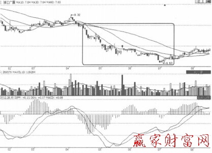 如圖1所示,在浙江廣夏的下跌趨勢中,該股在緩慢的回升過程中,MACD指標已經重新回到零軸線之上,并且開始橫向發展。該股的長期弱勢下跌的趨勢還沒有發生根本的變化,并且成交量也沒有顯著的放大跡象出現。因此,MACD的反彈應該當做股價反彈過程中的一種副產品。當MACD指標再次出現死叉的時候,股價就會再次下跌,投資者應該做好提前出貨的準備了。