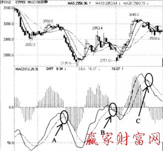 在B處,期價經(jīng)過反復(fù)的震蕩,在接近0軸時MACD指標(biāo)出現(xiàn)了死亡交叉,這時也可以適量做空。期價經(jīng)過短暫回調(diào)后,又開始上漲,在C處,即在正值區(qū)域MACD指標(biāo)又出現(xiàn)了死亡交叉,這時投資者要及時做空。