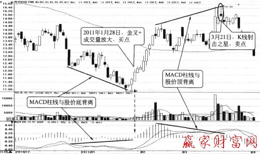 如圖所示,2011年1月,東風科技(600081)在MACD指標出現MACD柱線與股價底背離的態勢,而1月28日形成金叉,同時成交量逐漸放大。這表明一波上漲走勢即將形成,投資者可以果斷買入,之后股價一路上漲,2011年3月21日,該股出現K線射擊之星形態的賣出信號,而此前一段時間的MACD柱線與股價出現頂背離,投資者要注意把握這個波段賣點。